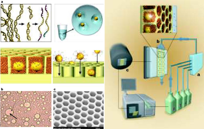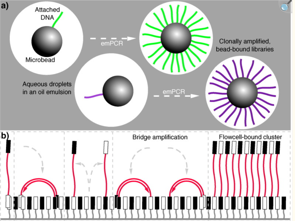 Image credits. Genomics. 2016 Jan;107(1):1–8.. Next-generation DNA sequencing parallelized amplification.(a) 454 sequencing: clonal amplification on beads (emulsion PCR); (b) Illumina/Solexa sequencing: bridge amplification on a flow cell.