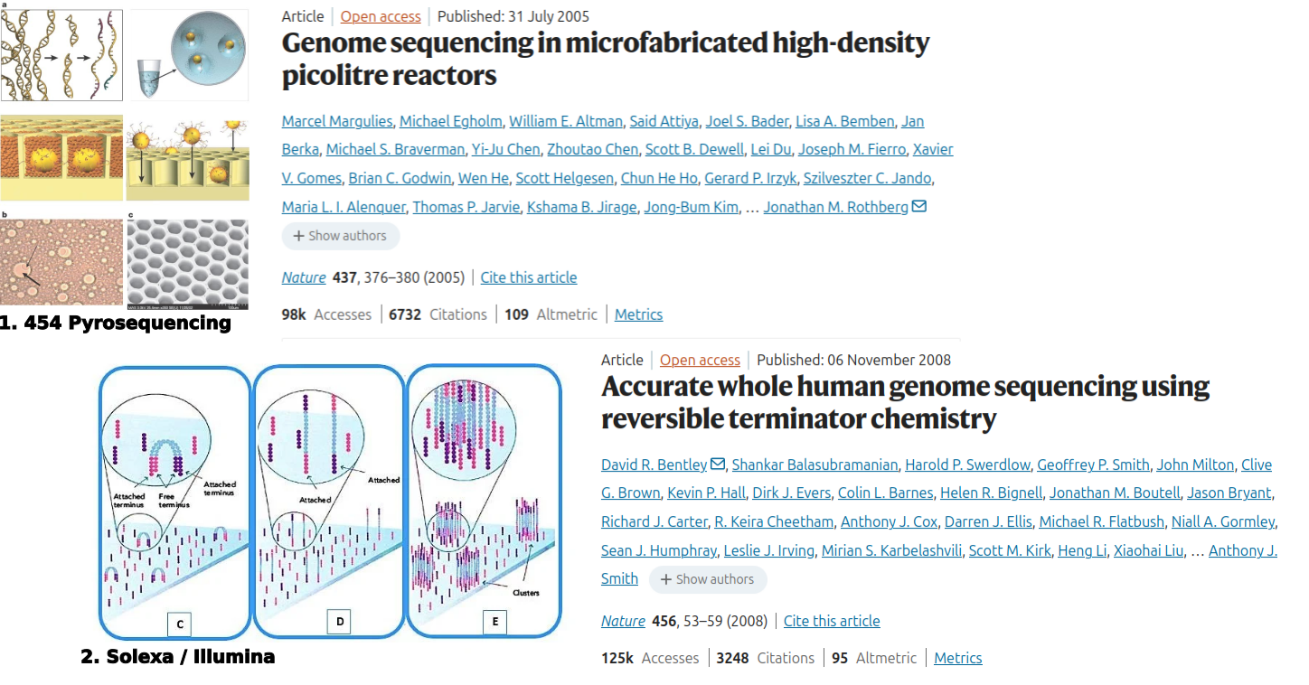 – Reuter JA, Spacek DV, Snyder MP. High-throughput sequencing technologies. Mol Cell. 2015 May 21;58(4):586-97. doi: 10.1016/j.molcel.2015.05.004. PMID: 26000844; PMCID: PMC4494749. - NHGRI resource on the evolution of human genome sequencing costs https://www.genome.gov/about-genomics/fact-sheets/Sequencing-Human-Genome-cost