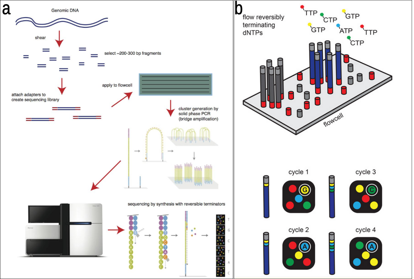 key features: massive parallel sequencing; short reads (50-200 bp); hundreds of millions–billions of reads per run