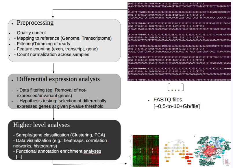 - Statistical analysis – Identifying significant patterns, such as differential expression, variant calling, or enrichment analysis.