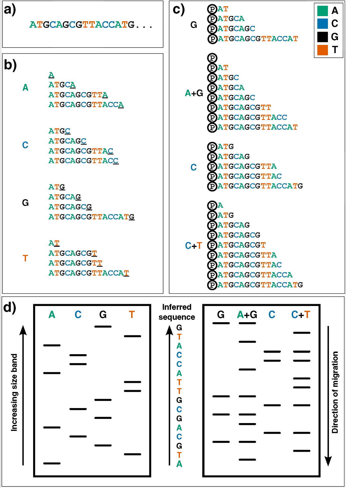 Image credits. Genomics. 2016 Jan;107(1):1–8.. First-generation DNA sequencing technologies. Example DNA to be sequenced (a) is illustrated undergoing either Sanger (b) or Maxam–Gilbert (c) sequencing. (d): Fragments generated from either methodology can then be visualized via electrophoresis on a high-resolution polyacrylamide gel: sequences are then inferred by reading ‘up’ the gel, as the shorter DNA fragments migrate fastest.