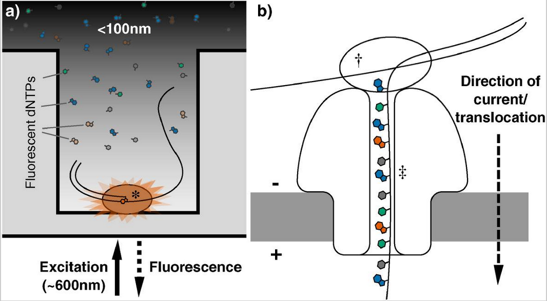 Image credits. Genomics. 2016 Jan;107(1):1–8.. Third-generation DNA sequencing technologies. (a): Nucleotide detection in a zero-mode waveguide (ZMW), as featured in PacBio sequencers. DNA polymerase molecules are attached to the bottom of each ZMW, and target DNA and fluorescent nucleotides are added. As the diameter is narrower than the excitation light's wavelength, illumination rapidly decays travelling up the ZMW: nucleotides being incorporated during polymerisation at the base of the ZMW provide real-time bursts of fluorescent signal, without undue interference from other labelled dNTPs in solution. (b): Nanopore DNA sequencing as employed in ONT's MinION sequencer. Double stranded DNA gets denatured by a processive enzyme which ratchets one of the strands through a biological nanopore embedded in a synthetic membrane, across which a voltage is applied. As the ssDNA passes through the nanopore the different bases prevent ionic flow in a distinctive manner, allowing the sequence of the molecule to be inferred by monitoring the current at each channel.